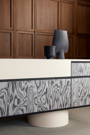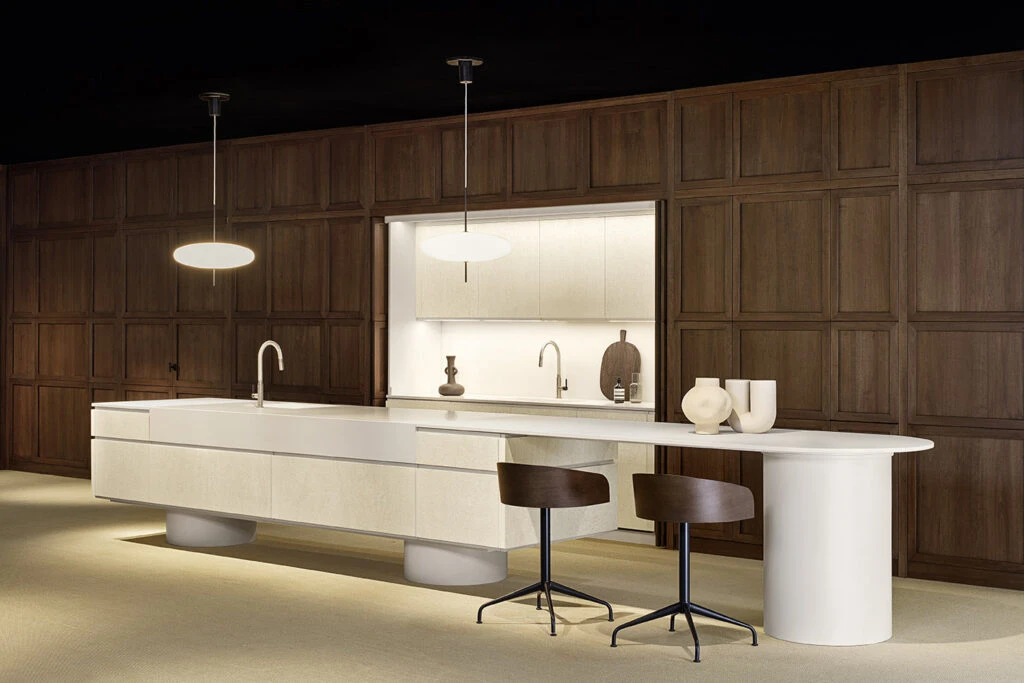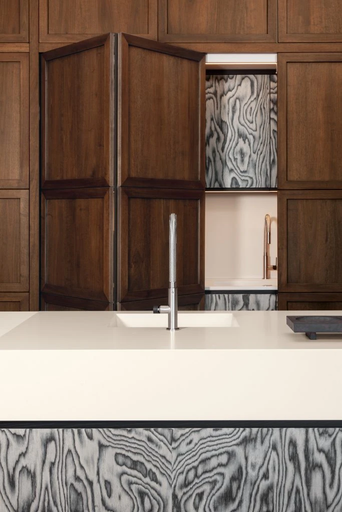 The Atlante wall panelling system, entirely crafted in premium timber, represents a visionary modern kitchen concept where bold shapes and unusual material combinations meet. Born from a collaboration with makethatstudio, this boiserie system is a masterclass in blending classical influences with contemporary compositional solutions. It is designed to accentuate the raw, natural beauty of wood, transforming vertical surfaces into a functional architectural "skin" that breathes life into the interior.