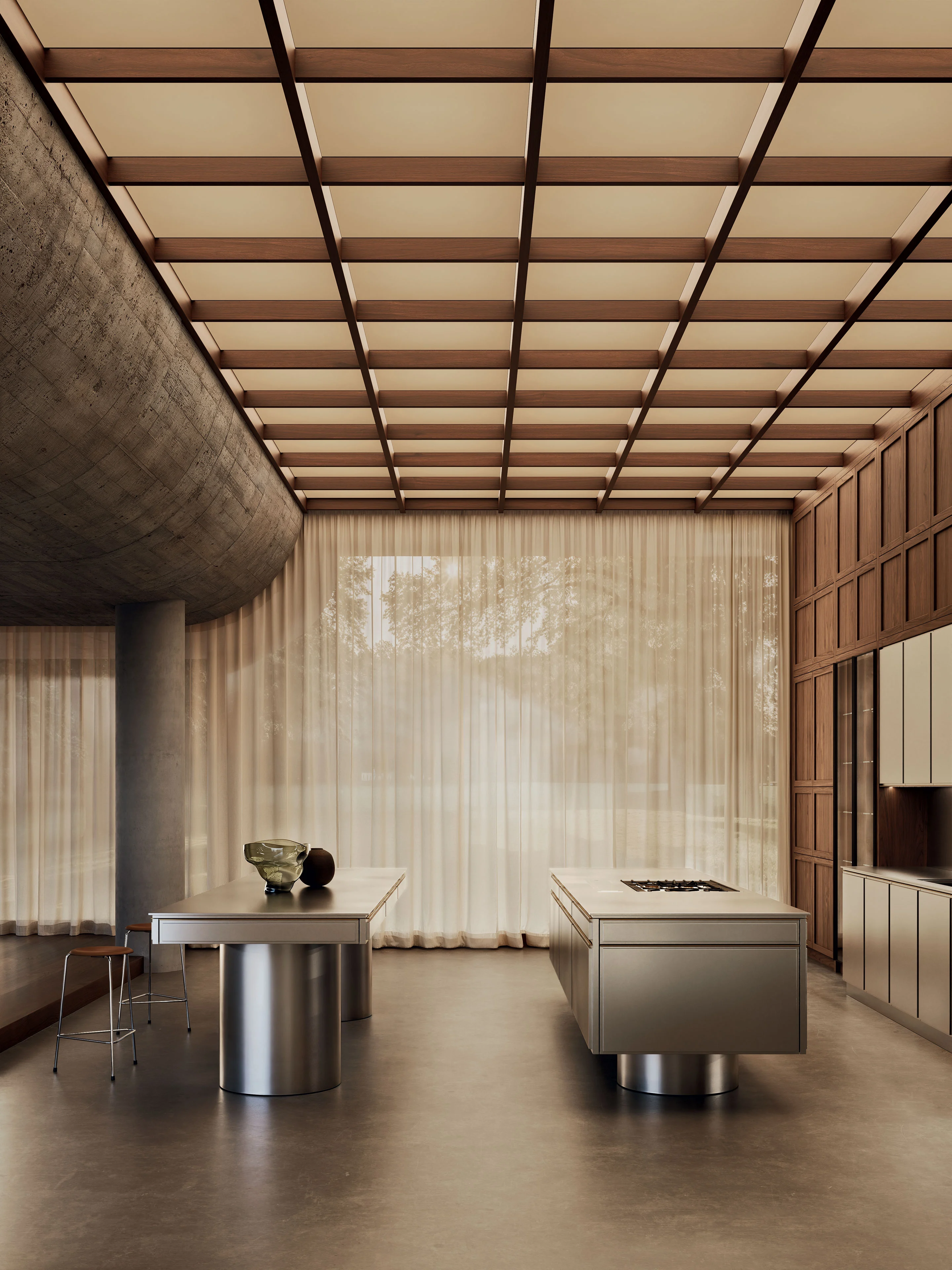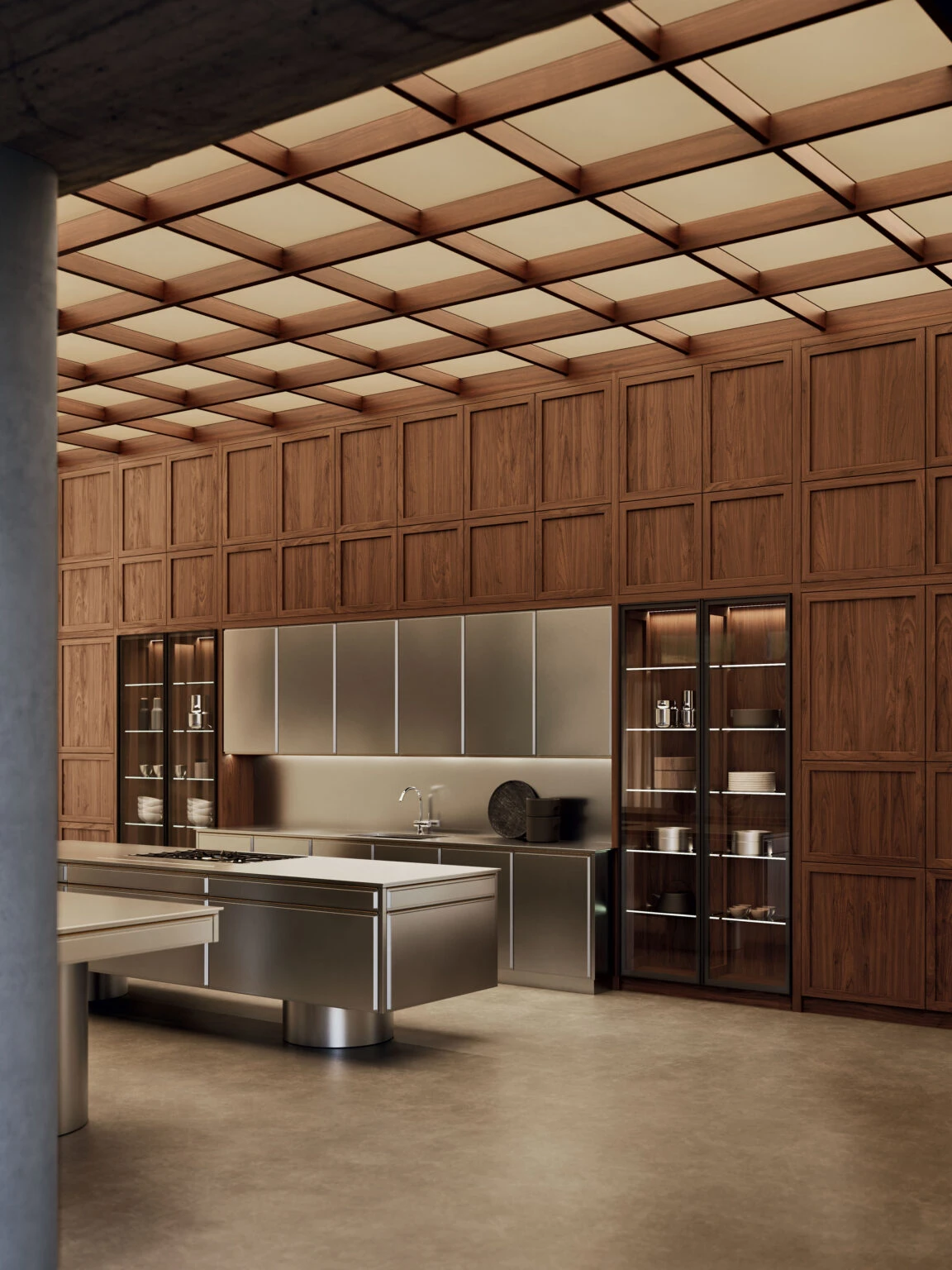 At the heart of the space, the central islands are engineered for a dual purpose: professional-grade operation and sophisticated conviviality. Every line is drawn with aesthetic rigor, ensuring that the kitchen remains as functional as it is beautiful. Complementing this, the Atlante wood panels conceal storage units and high-end appliances, dressing the environment in a cohesive, timeless elegance. Through this deliberate balance of materials, the Atlante+Virtus collection defines a kitchen environment that is essential, sophisticated, and built to endure beyond passing trends.