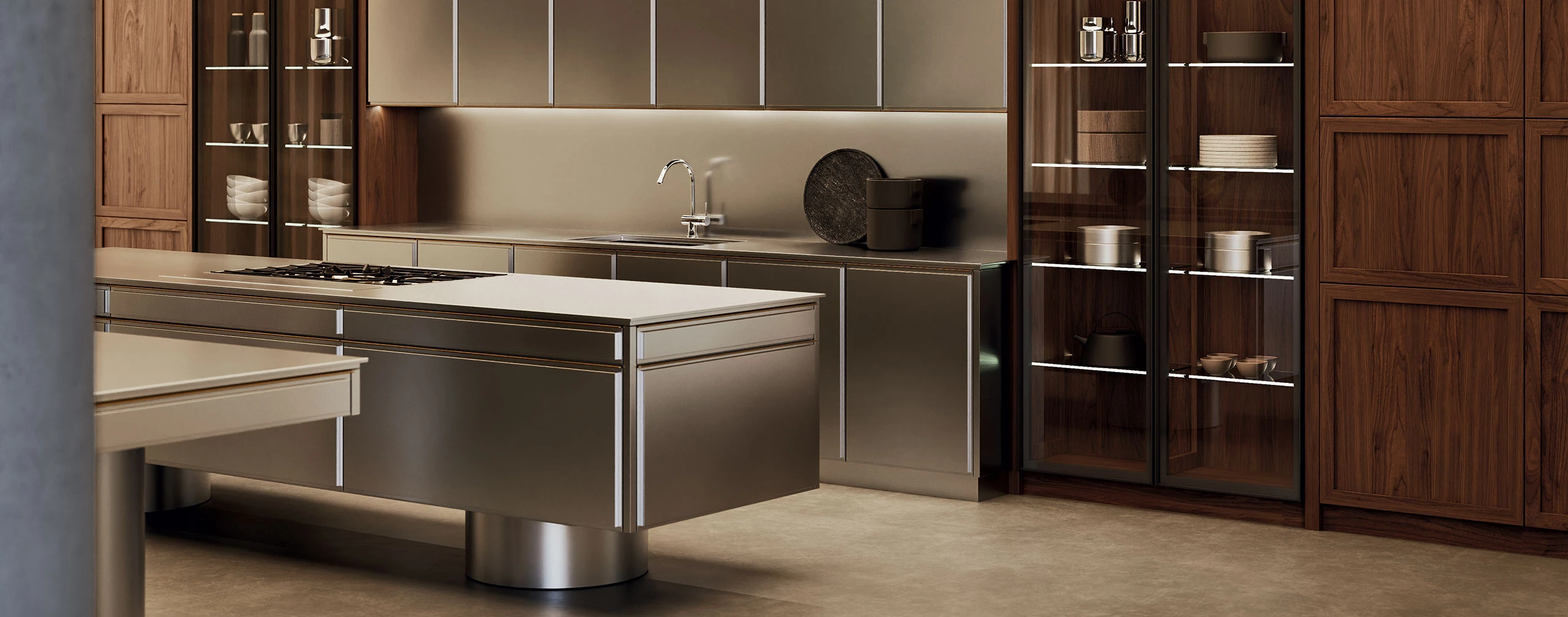 The new Atlante+Virtus kitchen represents a masterful dialogue between the bold, contemporary character of vintage brushed steel and the organic elegance of Tobacco Walnut. This composition is defined by the encounter of contrasting textures, where the cool, industrial aesthetic of metal is softened by the handcrafted warmth of full-height boiserie. The Virtus steel doors feature a smooth, three-dimensional framed effect, meticulously enhanced by a brass profile that serves as both a visual highlight and a discreet, ergonomic handle for seamless opening.