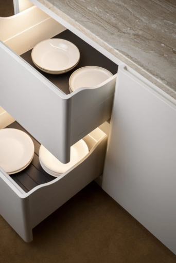 True luxury, however, lies in the uncompromising attention to detail. Behind the handcrafted facades, the interior engineering is equally refined: every drawer is equipped with specialized non-slip linings and silicone inserts. This meticulous touch ensures that fine dinnerware remains secure and silent, embodying the masterful craftsmanship and functional perfection that define the L’Ottocento experience.